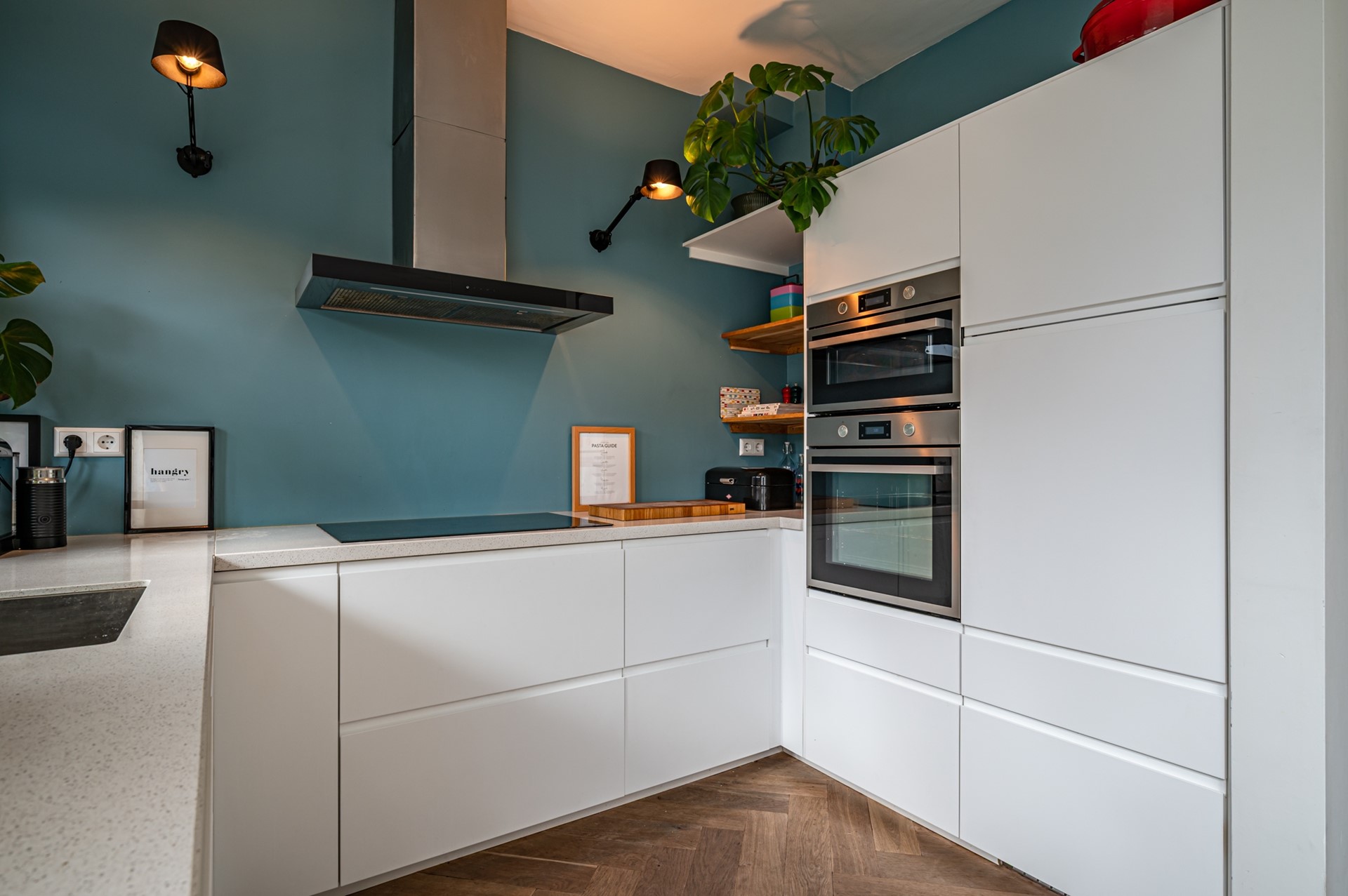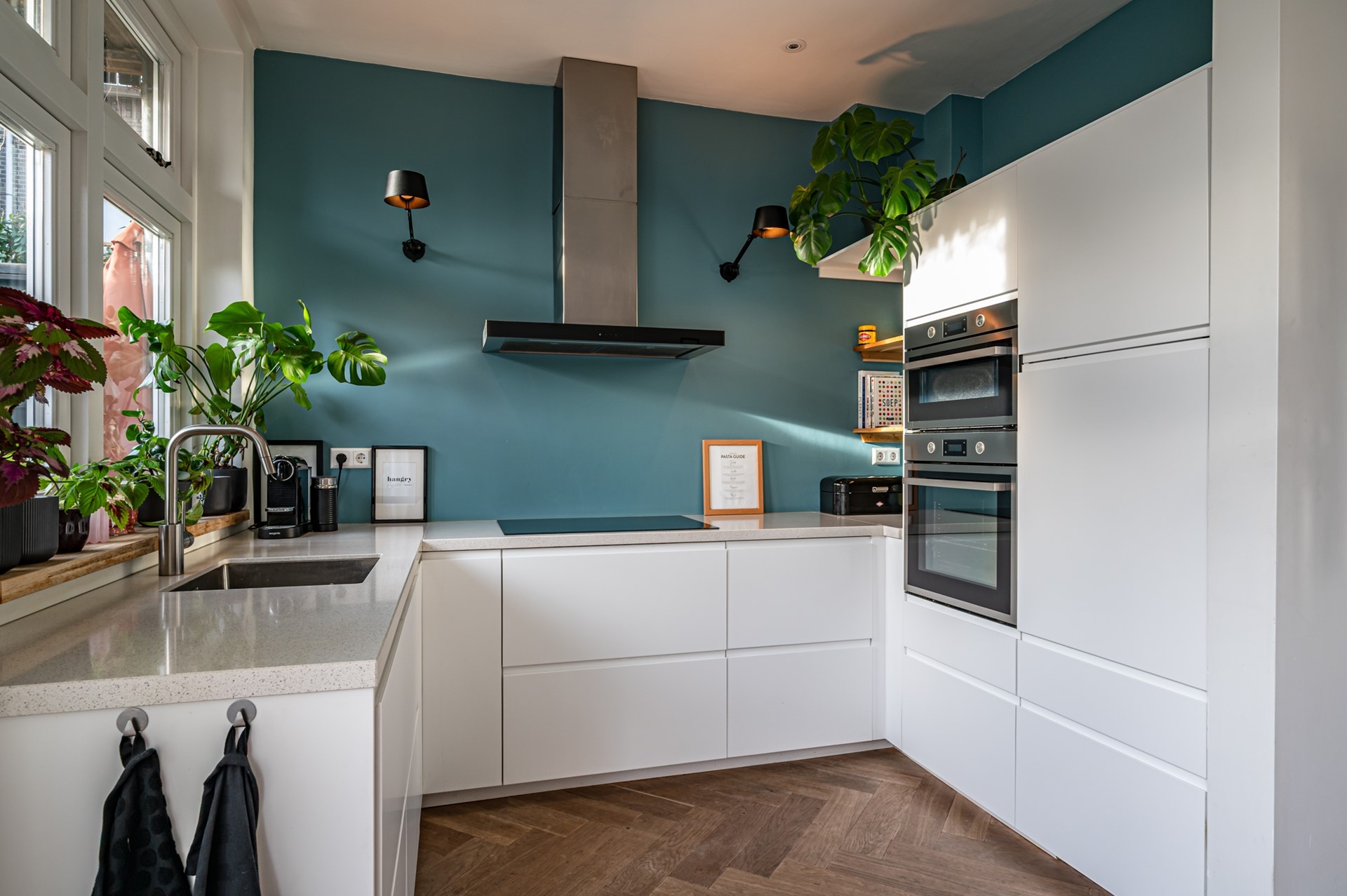 eikenhouten vloer en openslaande tuindeuren naar het achtertuintje. Open keuken in hoekopstelling