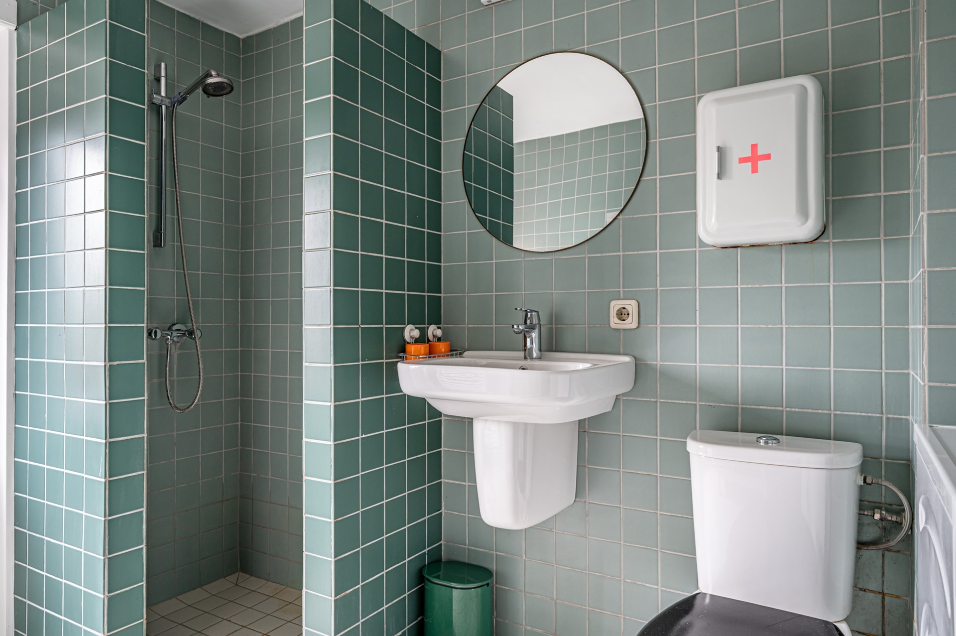 Overloop, drie slaapkamers, badkamer met douche, vaste wastafel, designradiator en