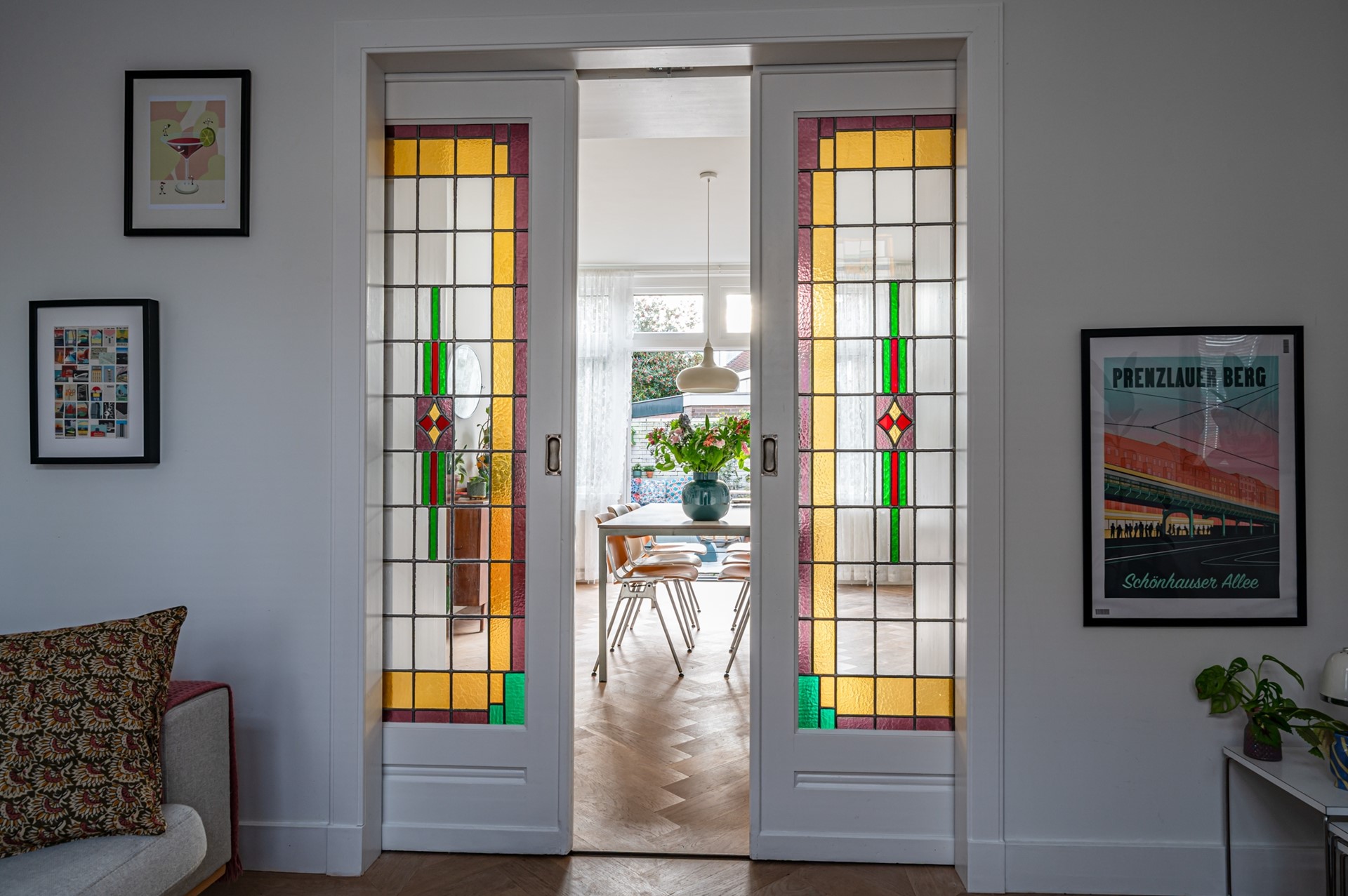Entree/hal met meterkast en separaat toilet. Royale kamer-en-suite met suitedeuren en glas-in-lood,