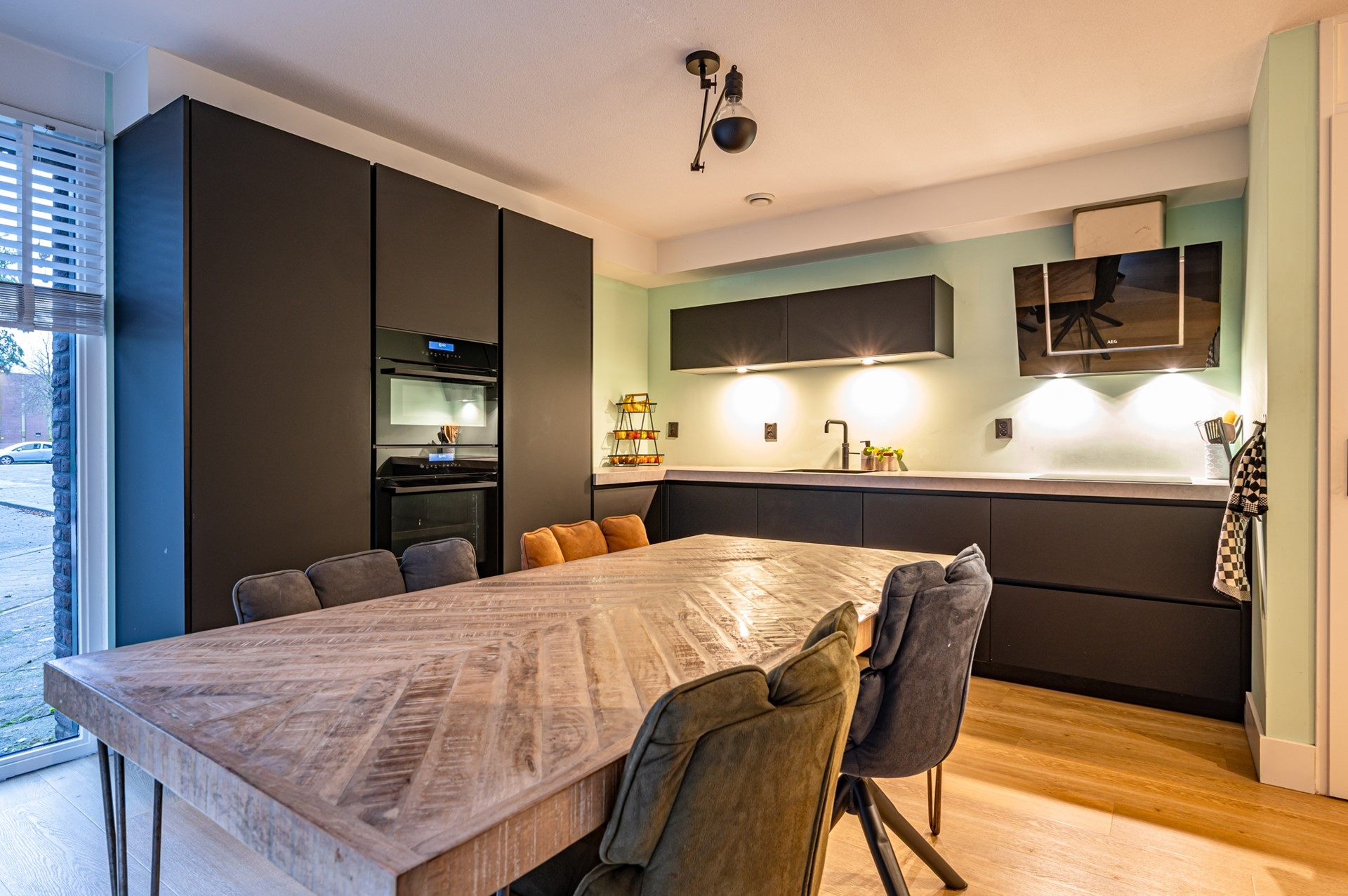 De keuken is uitgevoerd in matzwart met een strak werkblad, veel bergruimte en een hoge kastenwand met inbouwapparatuur.