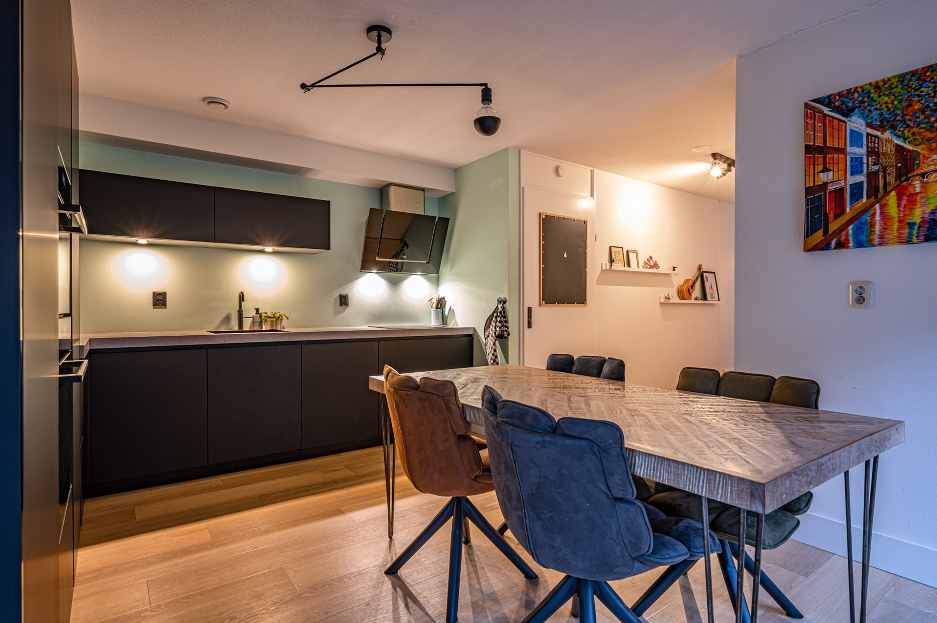Aan de straatzijde ligt de keuken met plek voor een royale eettafel; hier kijk je mooi vrij weg.